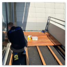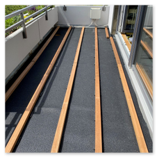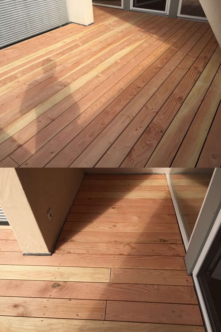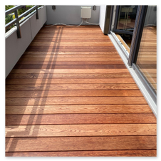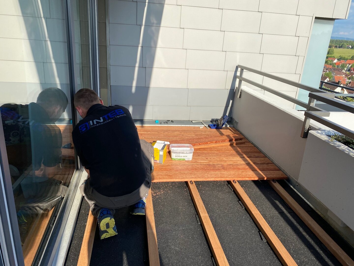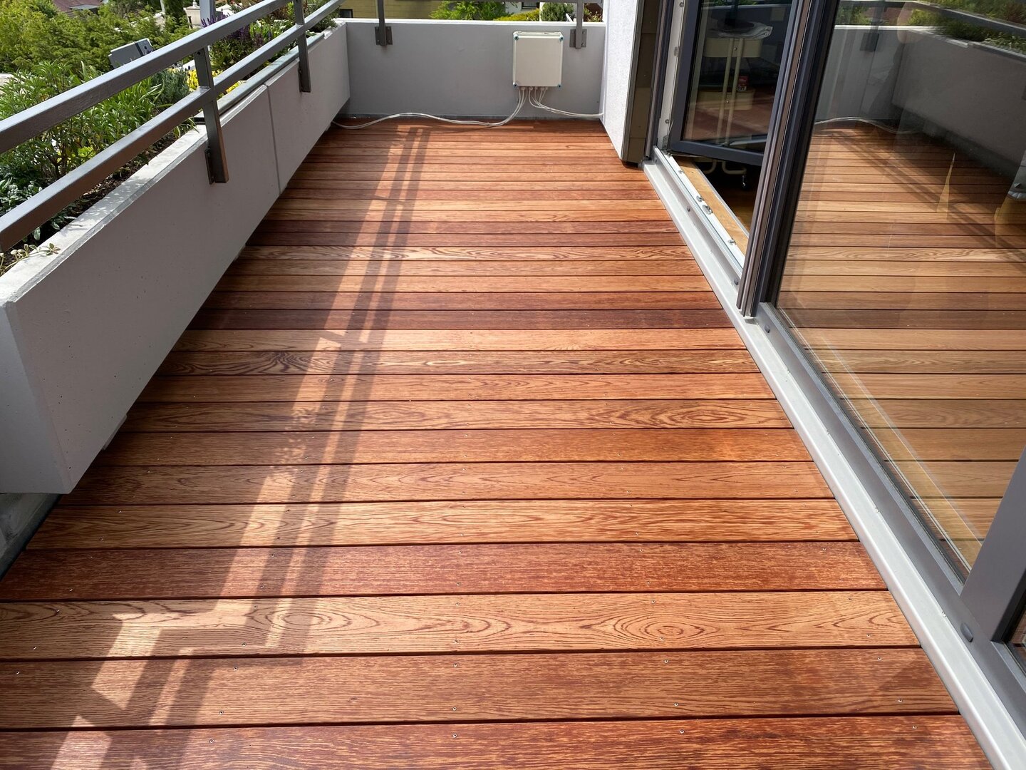 Auf einem Balkon wurde zunächst eine Alu-Unterkonstruktion verlegt und verdeckt (mittels Klammern) verschraubt. Anschließend die neuen WPCDielen, die der Kunde selbst eingekauft hatte, verlegt.