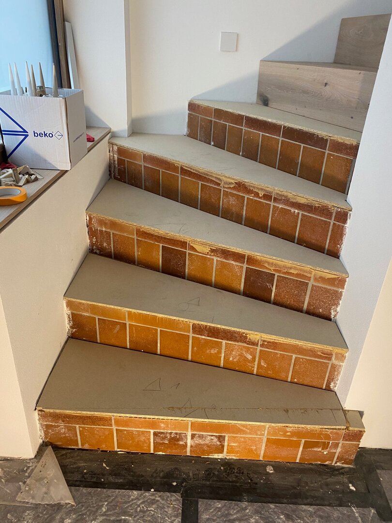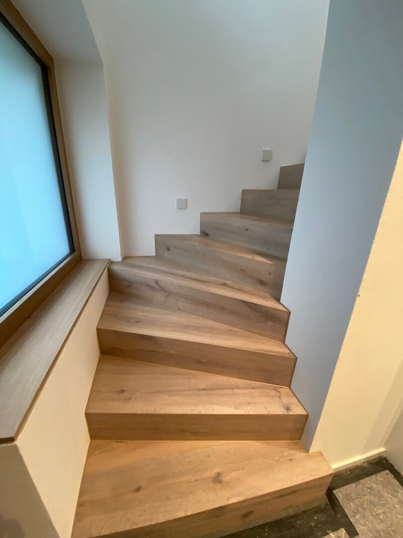 Eine nicht mehr zeitgemäße Treppe wurde mit Laminat vollflächig neu gestaltet. Alle Fugen wurden silikoniert